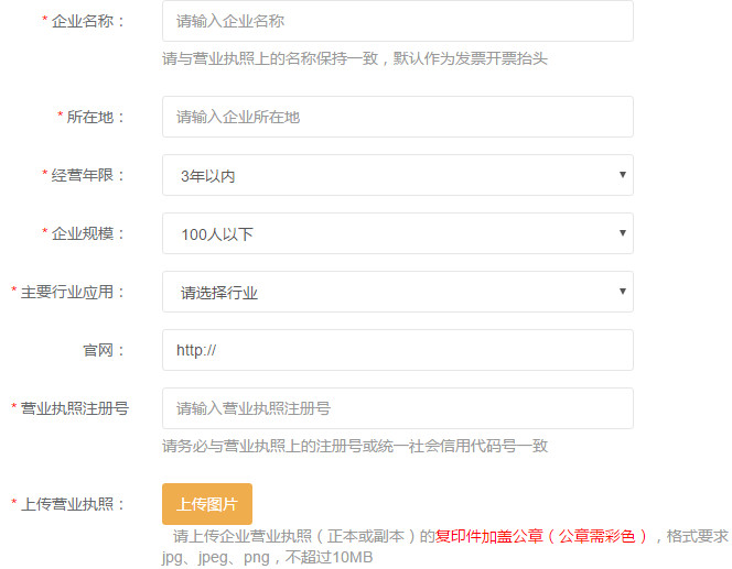 用戶使用服務之前需要先完成企業實名認證,如下圖;