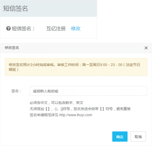 用戶完成企業實名認證并充值帳號余額之后,點擊-【驗證碼通知短信】-【短信發送】-【簽名/模版管理】-【修改】,添加自定義簽名,點擊【確定】即可。