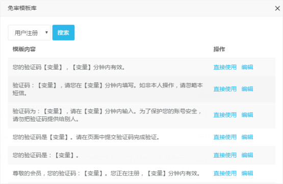 1、免審模版添加。用戶點擊【免審模版庫】,選擇與自己業務相符合的短信模版內容,點擊【直接使用】,模版立即可以使用;點擊【編輯】并修改部分內容,該模版就變成自定義模版需要審核通過方可使用。