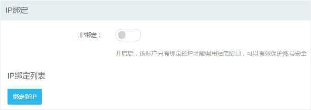 用戶點擊-【驗證碼通知短信】-【短信設置】-【IP綁定】,可以開啟IP白名單功能,開啟之后,只有已綁定的IP才可使用短信服務。